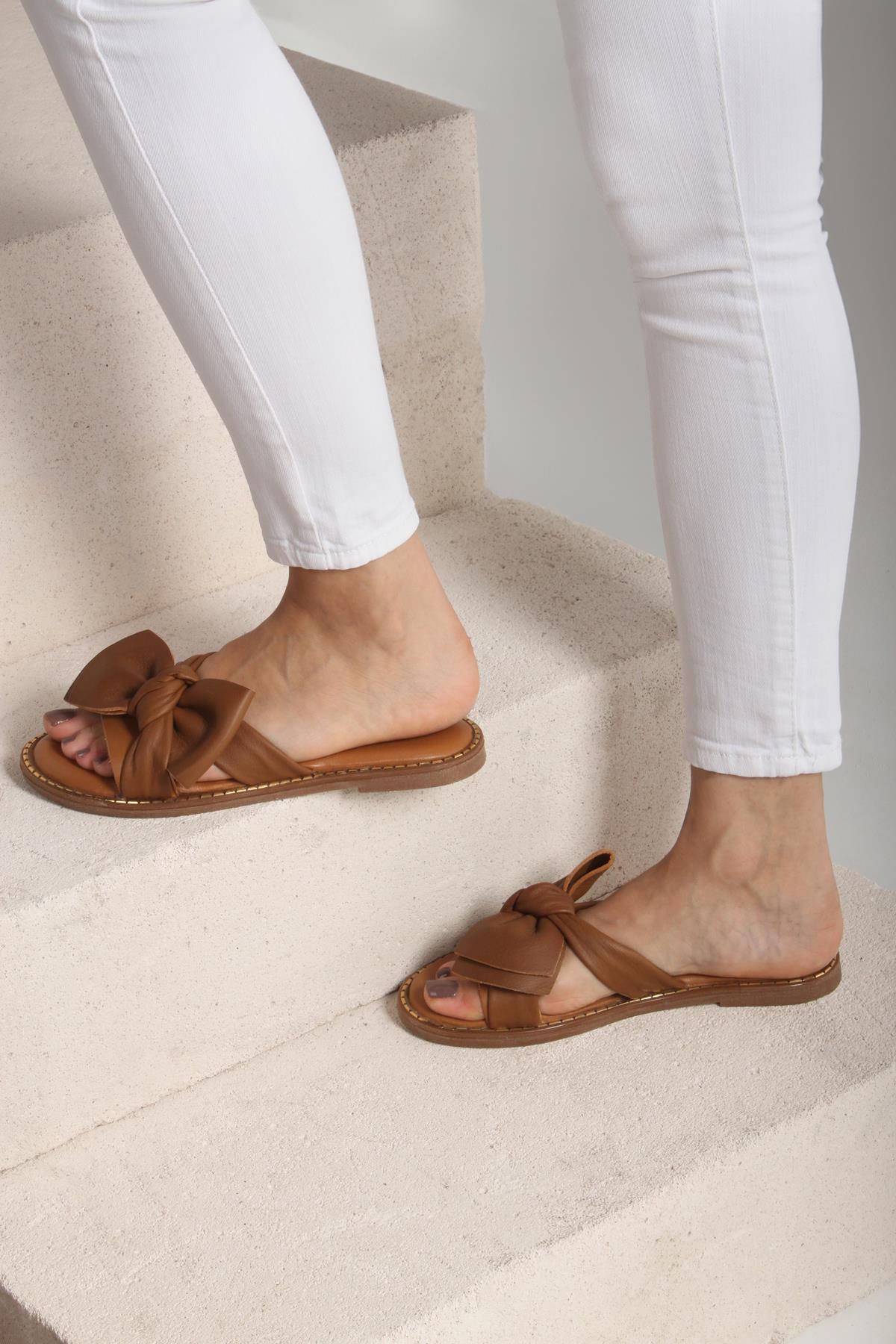 Majensia 131702 Taba Deri Terlik, fiyonk detayı ve rahat yapısıyla şık bir günlük seçenek sunar. Yaz kombinlerine zarif bir dokunuş katar.