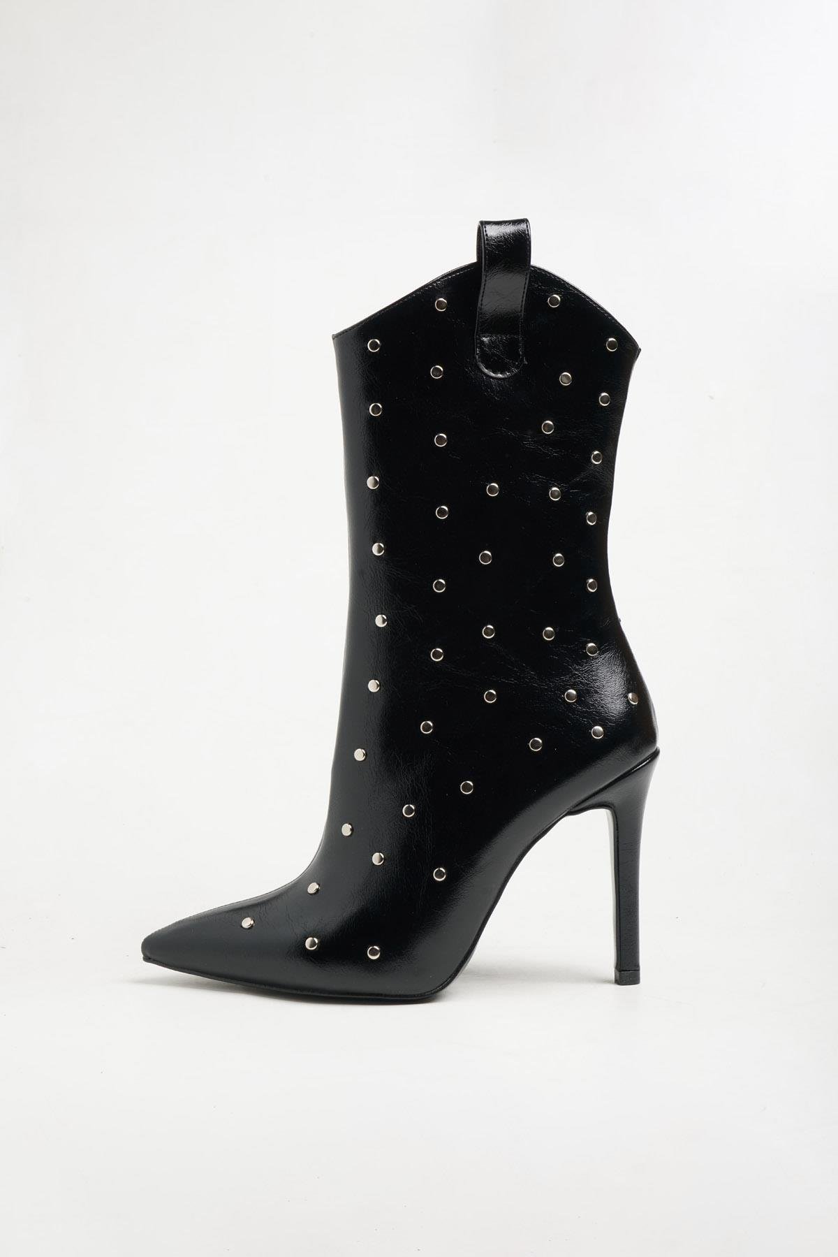 Majensia 251412 Taş Detaylı Topuklu Bot Siyah Kırışık Rugan